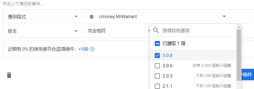 1. 點擊要設定的條件方框會出現以下畫面,選擇應用程式和想要規範的版本