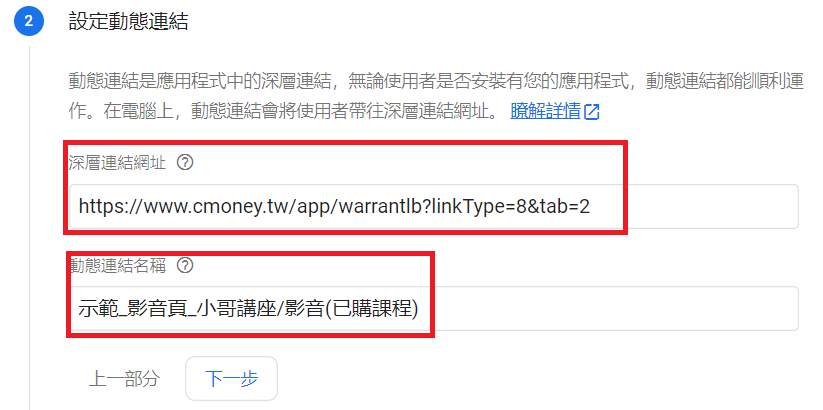 將要跳轉畫面的參數用JSON格式寫在深層連結網址,並為這個深度連結命名