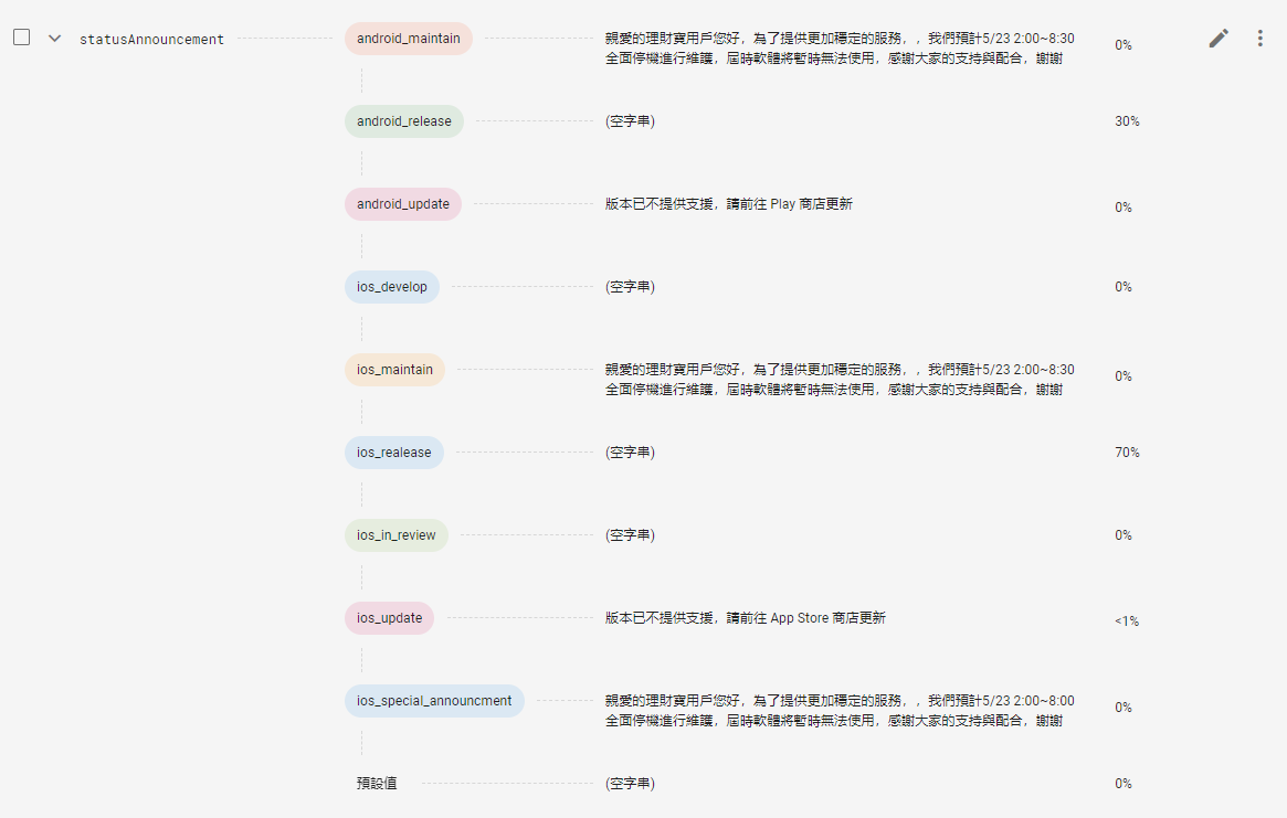 在remoteConfig的statusAnnouncement參數裡針對停機維護設定相關的內文