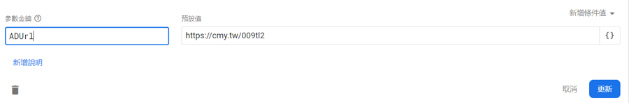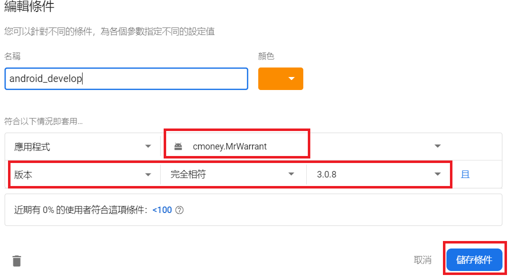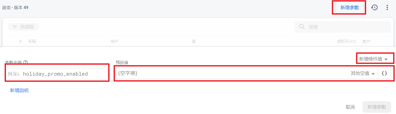 如果有需要這個參數只有某些版本(condition,下面會提到)可以接收到的話,點擊又上方的新增條件值,並輸入在那個條件裡要放什麼參數
