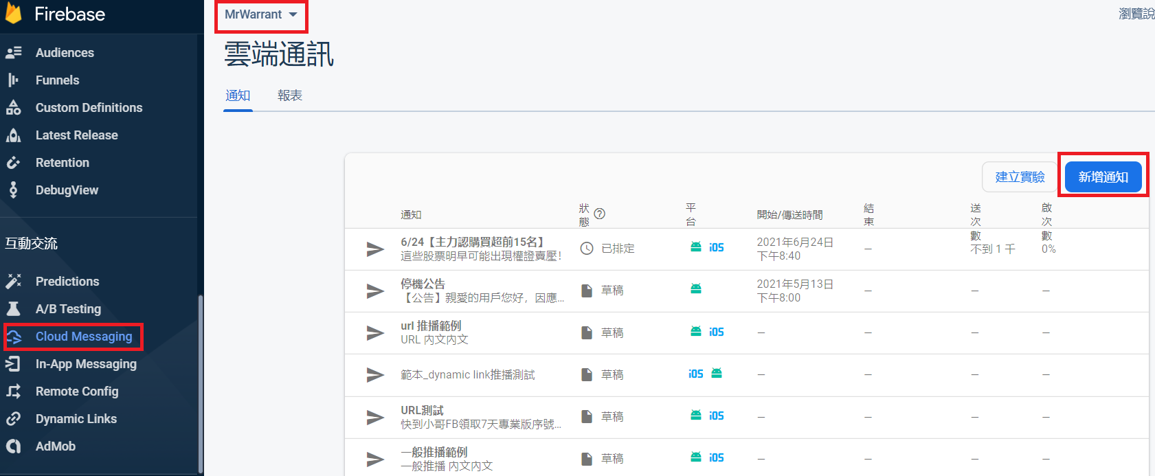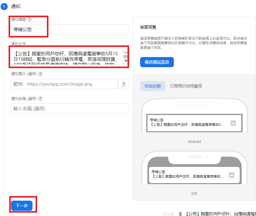不知道大家在新增通知時有沒有發現右邊有一個測試通知,究竟那是幹嘛用的呢? 其實就是跟字面上一樣可以給我們測試用的,在這個通知還沒發建立完之前我們可以先在測試機或虛擬機上測試