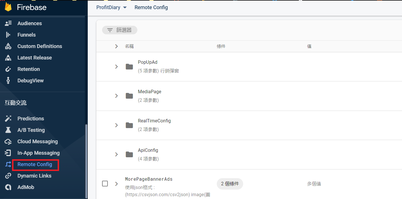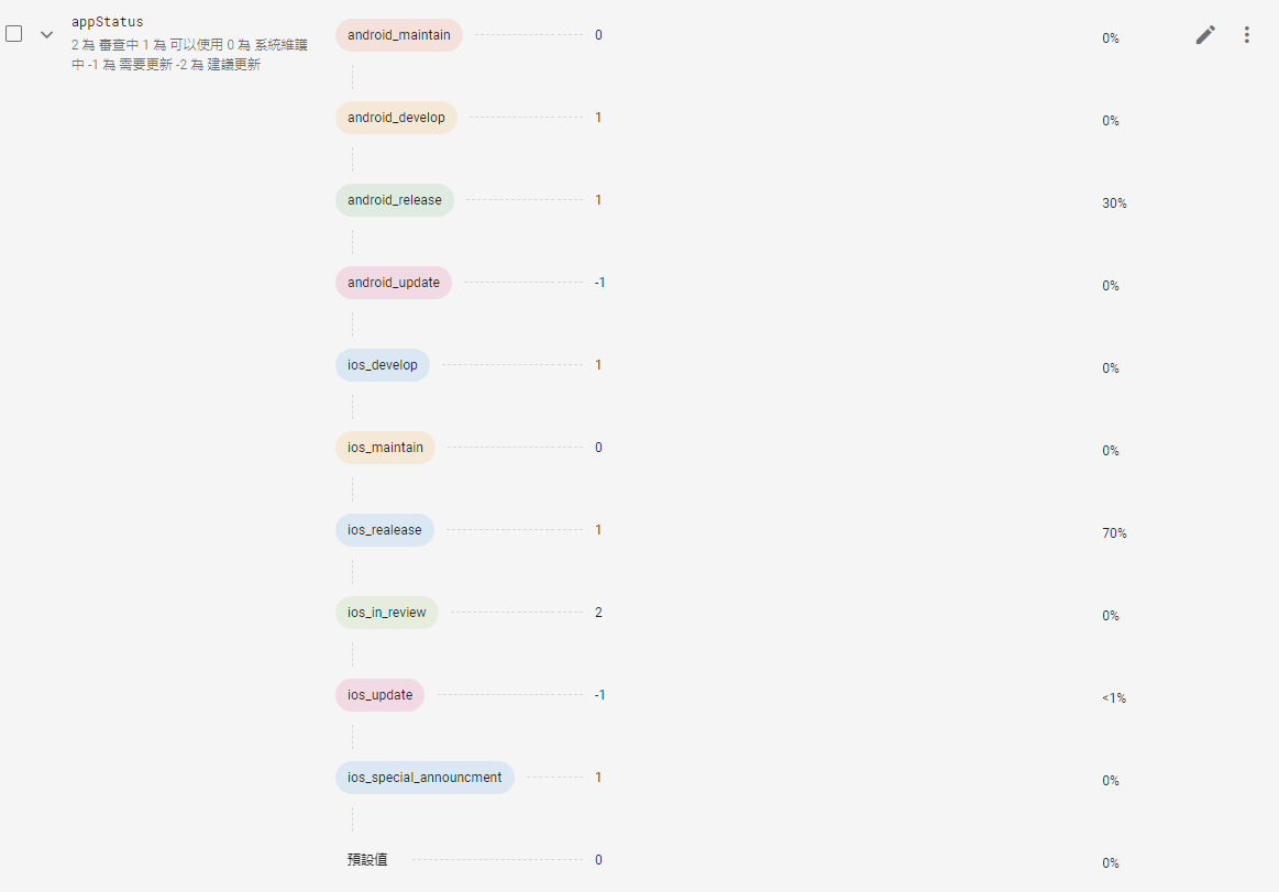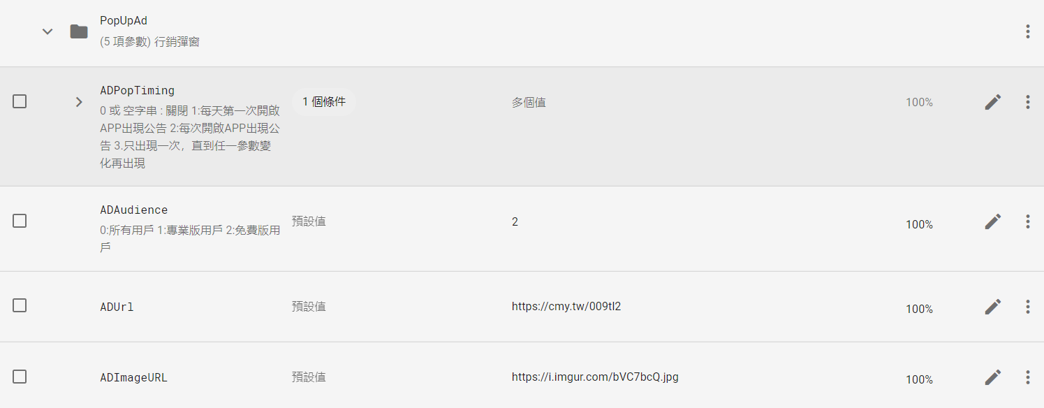 可以藉由建立參數即條件,即時去更改app上的接收到的資料和行為,像是可以設定app彈窗廣告文案內容,或是app強制更新等狀態,也可以將試用金鑰用此功能設定,只樣以後要改參數就只需要更動網站參數,不用動到app