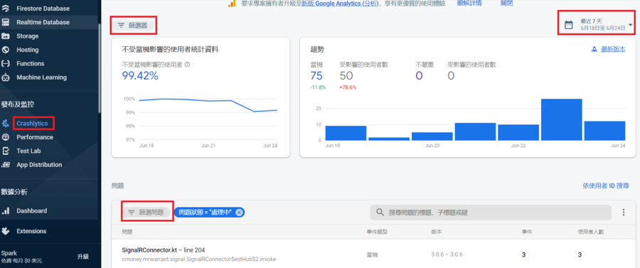 簡單說一下,左邊的Crashlytics顧名思義就是可以看到app的閃退率狀況,只要RD有在程式碼裡面做相關引入設定,就可以在這裡看到資料,並且依照篩選器選擇版本機型即解決狀態,右邊可以選擇時間,建議固定時間可以記錄下來,因為資料有保存期限(目前看起來是只保留近4個月的資料) 另外建議RD每天可以上來看一下目前閃退的問題並及時修正。