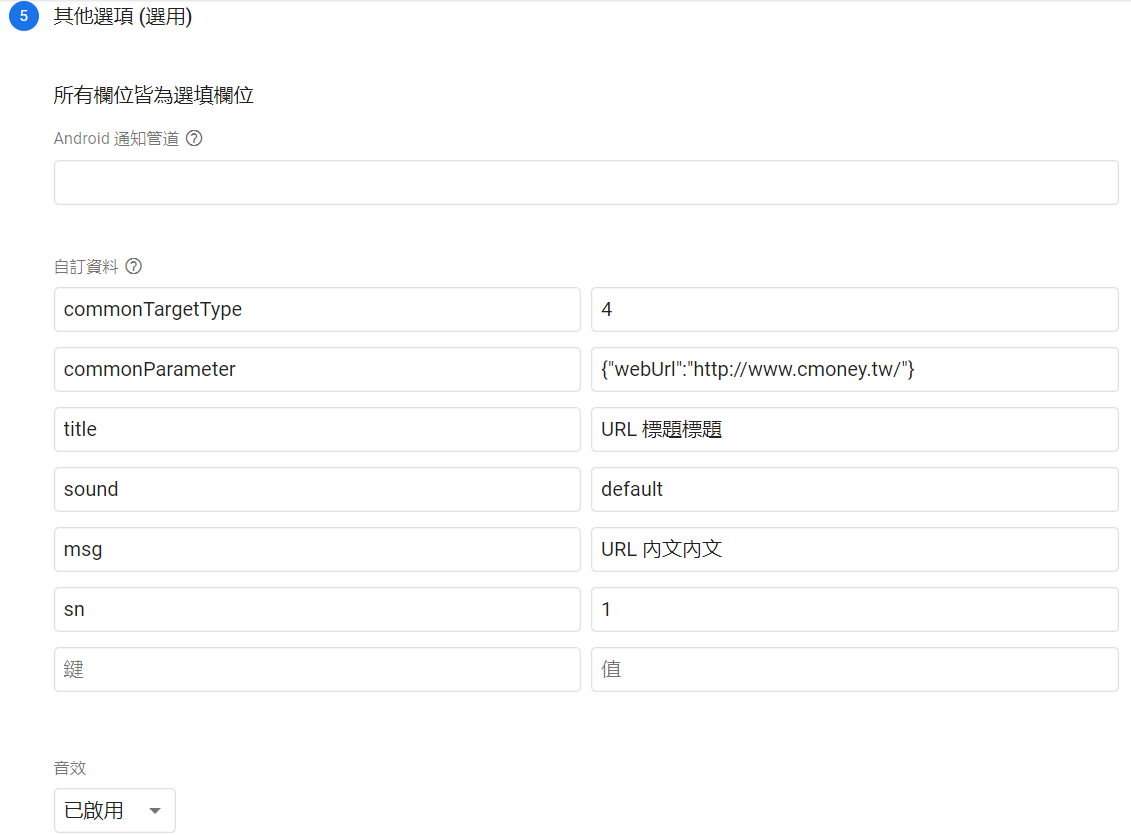 先點擊新增參數,並輸入參數名稱和內容(參數名稱要用英文,然後盡量好好設定,工程師會依照設定的參數名稱去抓資料內容),內容就是將要傳送的資料用JSON格式字串表示