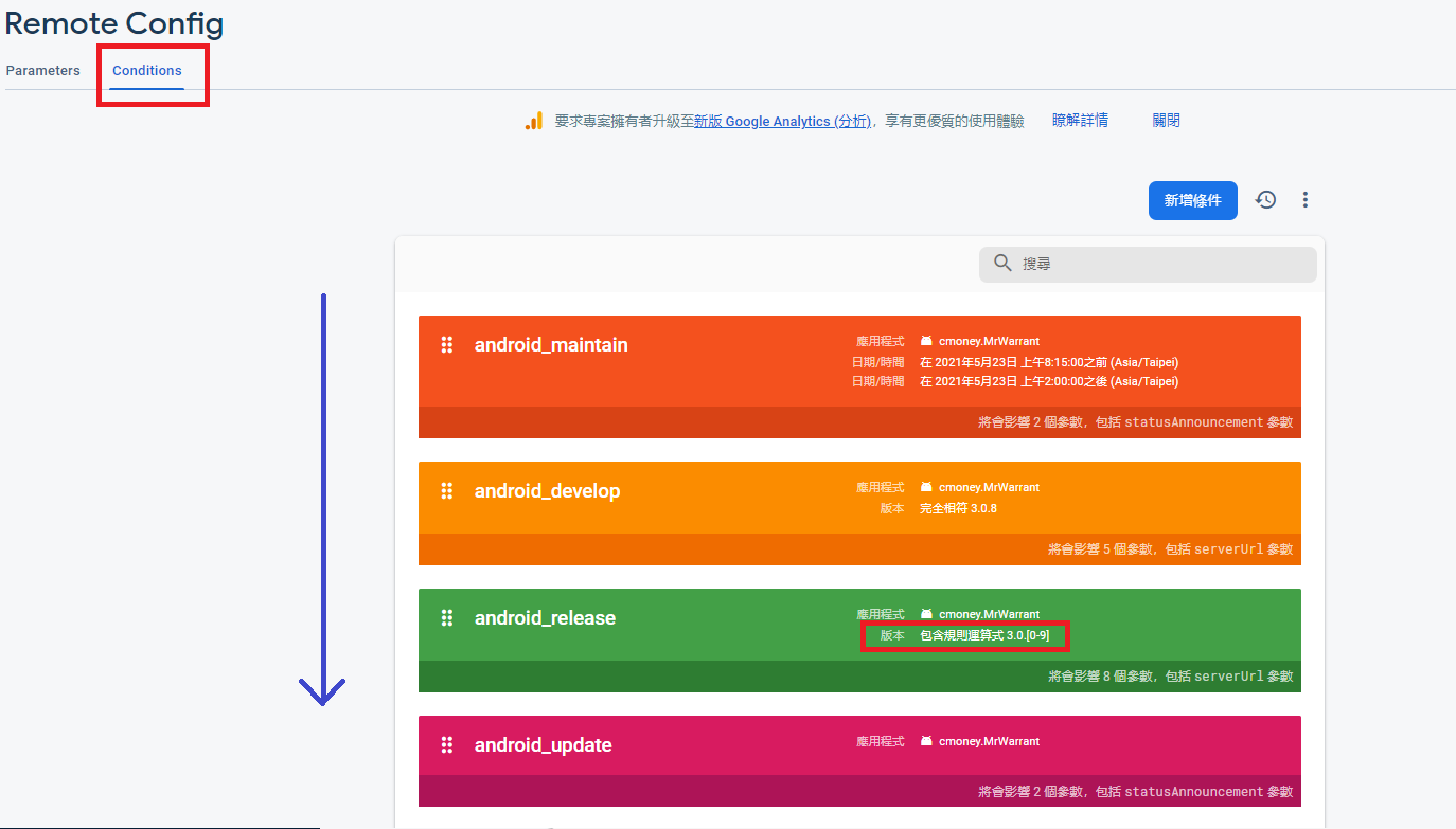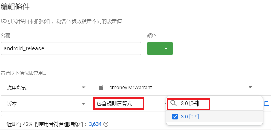 還記得前面有說可以設定條件值限定特定版本接收資料,但在新增條件值之前,首先要先設定condition -> 白話文就是你要跟firebase說你的哪幾個版本是在哪一個條件