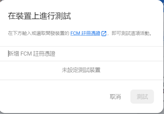 點擊測試通知,他會要求你要輸入FCM憑證,那這憑證是從哪裏拿呢?點選連結會有對應的教學