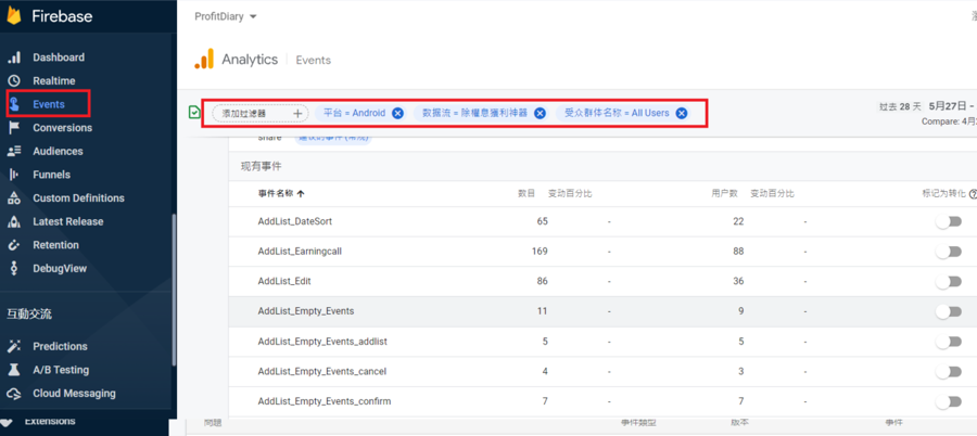 以Firebase來說,可以在events裡看到埋點的資料,並可以藉由上方的篩選器來篩選你想要的條件