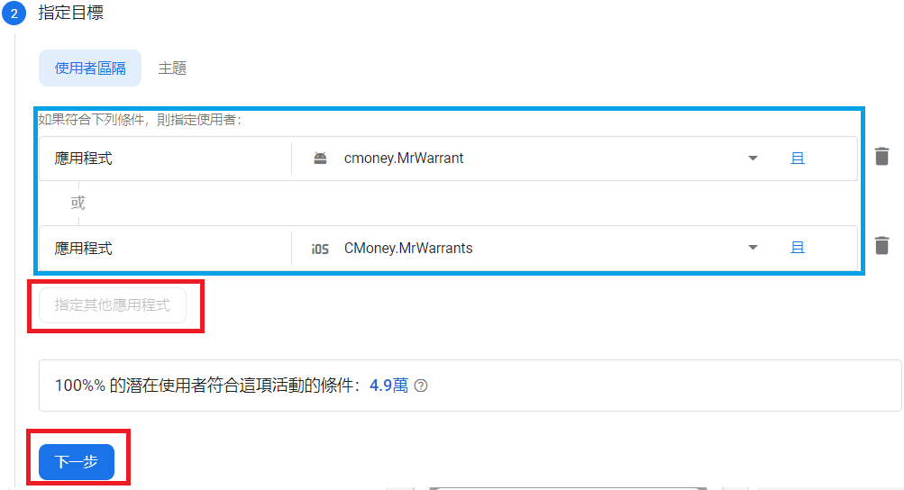 點擊"指定其他應用程式",選擇指定推播的平台(通常雙平台都會選),選完後會出現在藍色框框,點下一步