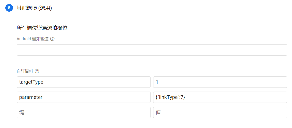paramete要用json字串格式放入依照各專案的深度連結參數 ex: {"linkType":7} json字串格式產出請參考連結