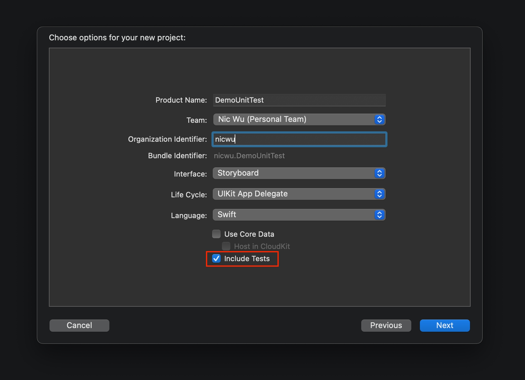 當我們在建立專案時,Xcode 會貼心的提醒要不要自動建立 Unit / UI Tests,只要勾選 Include Tests 則會自動產生 Unit / UI Tests 的 Target(圖1)。